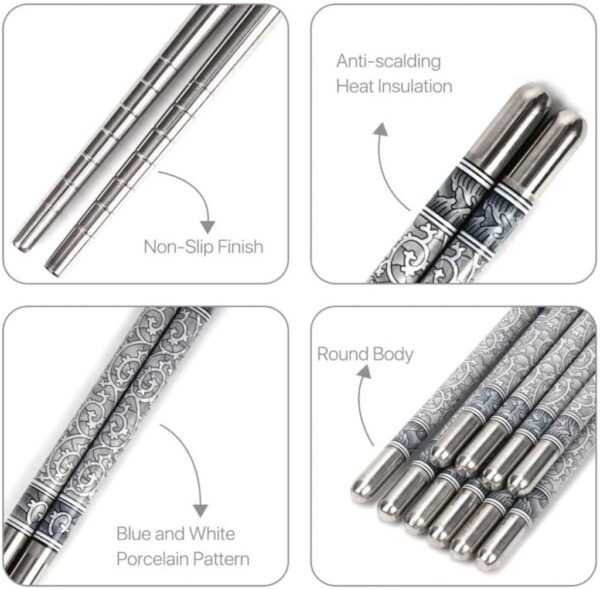 Title: Stainless Steel Round Chopstick Dishwasher Safe Lightweight Easy to Use Metal Chop Stick Utensils, Grey and White Porcelain Pattern Non-Slip Chopsticks Tableware Set, Reusable (5 Pairs Set)